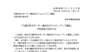 熊本市からのお知らせ 介護予防サポーター養成及びフォローアップ講座へご参加の皆さま この度は、熊本市介護予防サポーター養成及びフォローアップ講座にご参加いただきありがとうございます。現在、全5回コースの講座のうち、各区とも1回目が終了したところですが、今般の新型コロナウイルス感染症の急激な再拡大に伴い、2回目以降の予定を変... 2022.01.21 熊本市からのお知らせ