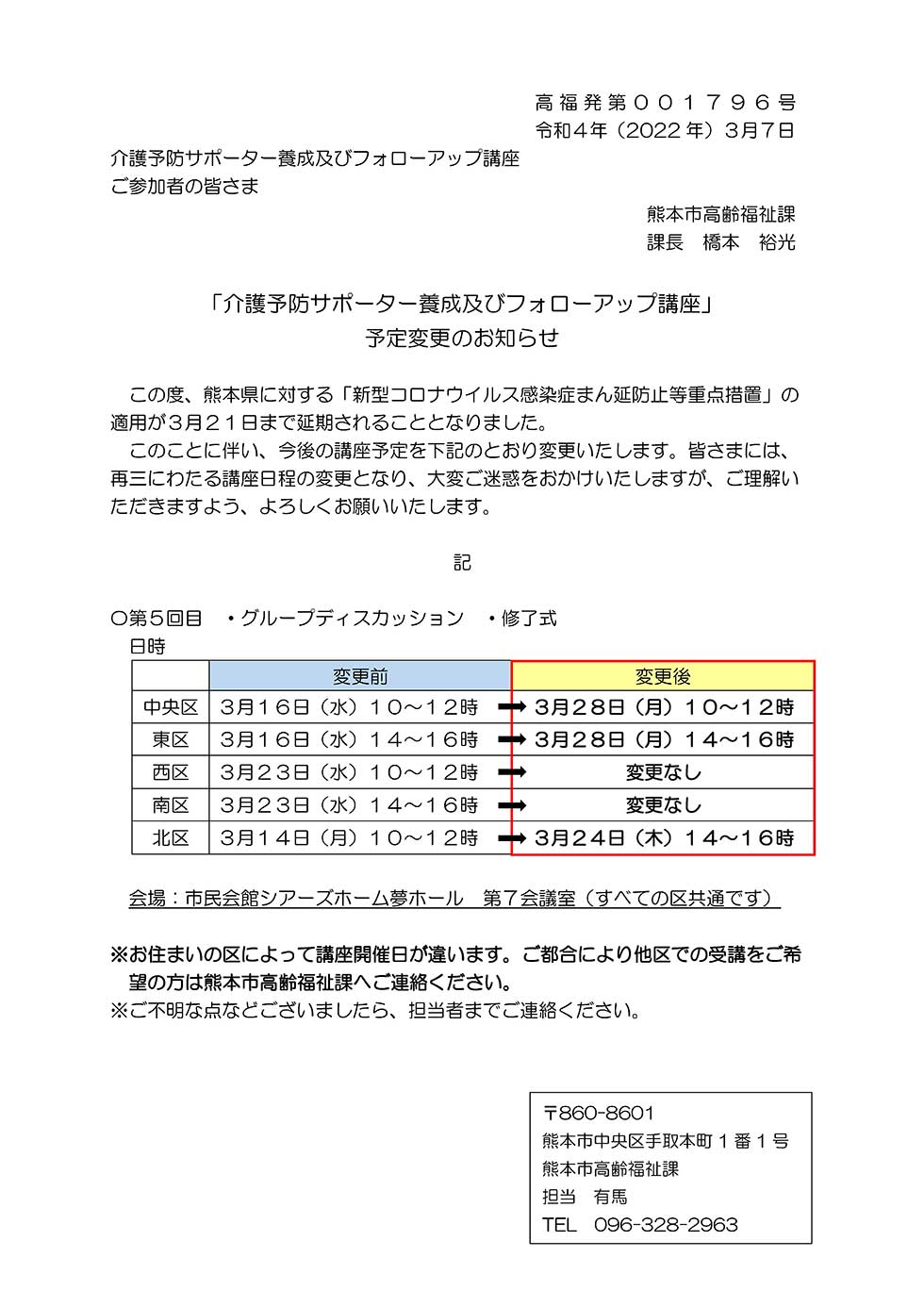 介護予防サポーター養成及びフォローアップ講座へご参加の皆さま 熊本市からのお知らせ 2022.03.08 この度は、熊本市介護予防サポーター養成及びフォローアップ講座にご参加いただきありがとうございます。 熊本県に対する「まん延防止等重点措置」の適用が3月21日まで延期されたことに伴い、講座予定を変更いたします。 皆さまには、再三にわたる講座日程の変更となり大変ご迷惑をおかけいたします。詳細については、下記画像をご確認ください。 熊本市 高齢福祉課 ※画像をクリックすると「介護予防サポーター養成及びフォローアップ講座へご参加の皆さま」のPDFが開きます。