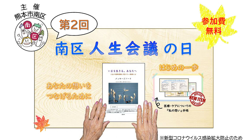 熊本市では、終末期医療に伴う「人生会議」の大切さや「メッセージノート」について皆さんに理解を深めていただくことを目的としたイベントを開催します。日時 11月12日(土) AM10:00~12:00(受付は9時30分から)