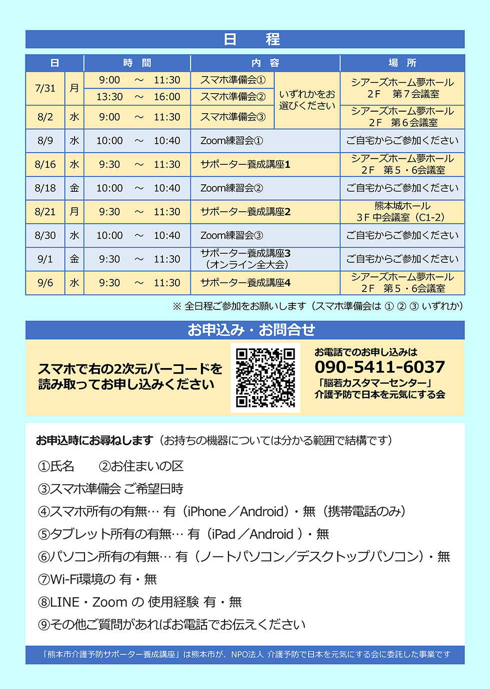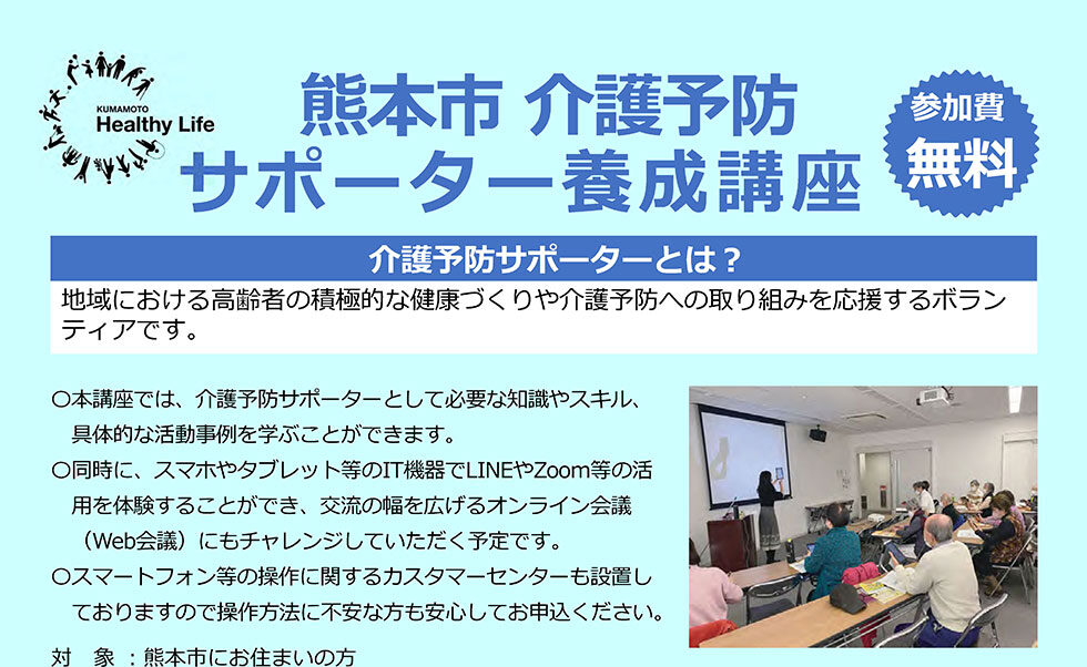 R5年度 熊本市介護予防サポーター養成講座 がはじまります 介護予防サポーター 2023.06.29 今年も新規で介護予防サポーターさんの養成講座を開催します。詳細は以下のチラシを御覧ください。 すでにサポーターの方の為のフォローアップ講座は10月に開催予定ですのでお楽しみに!