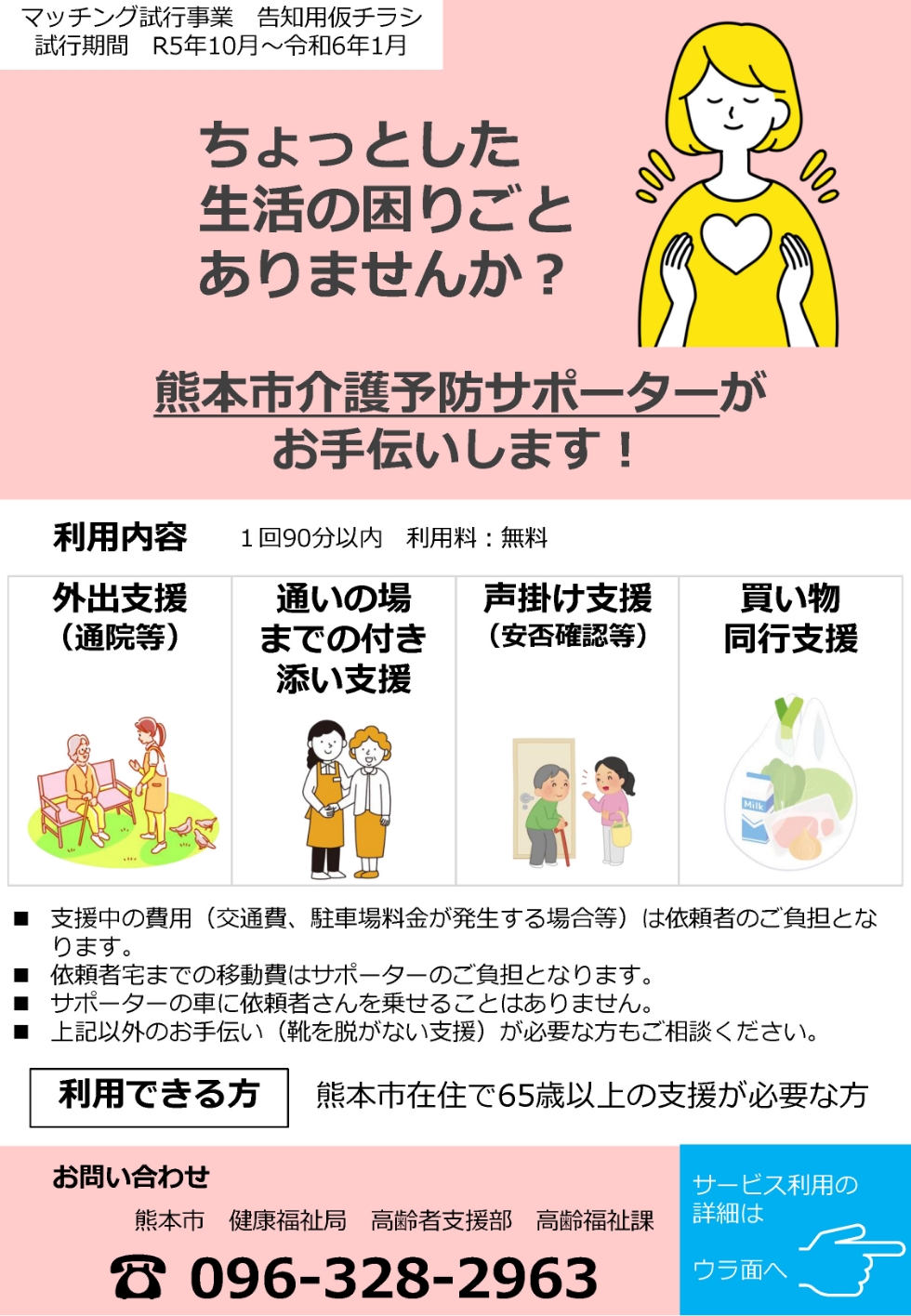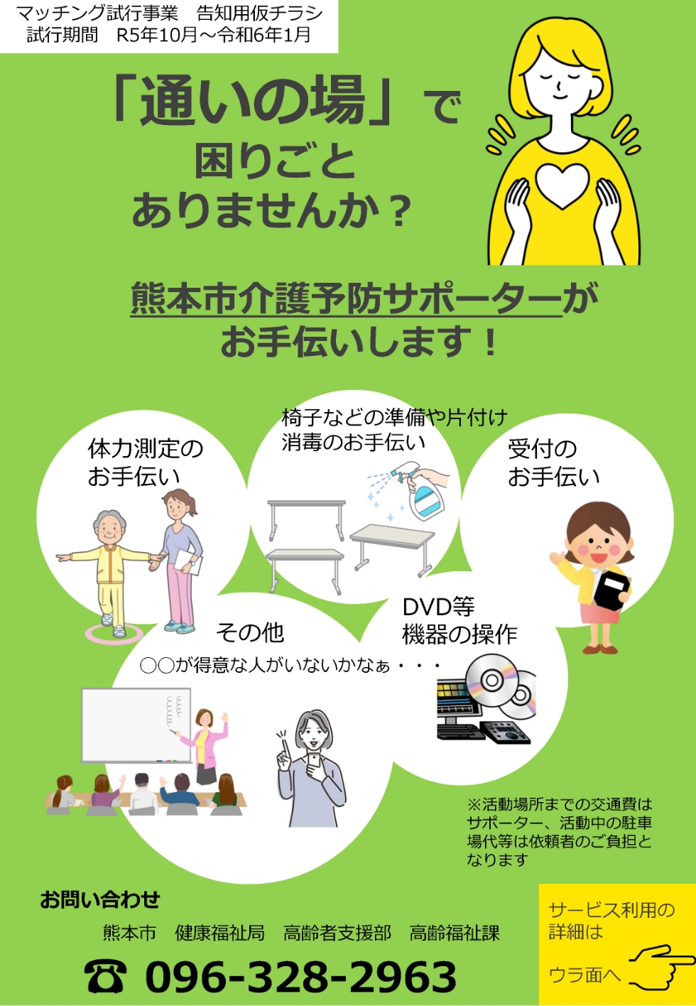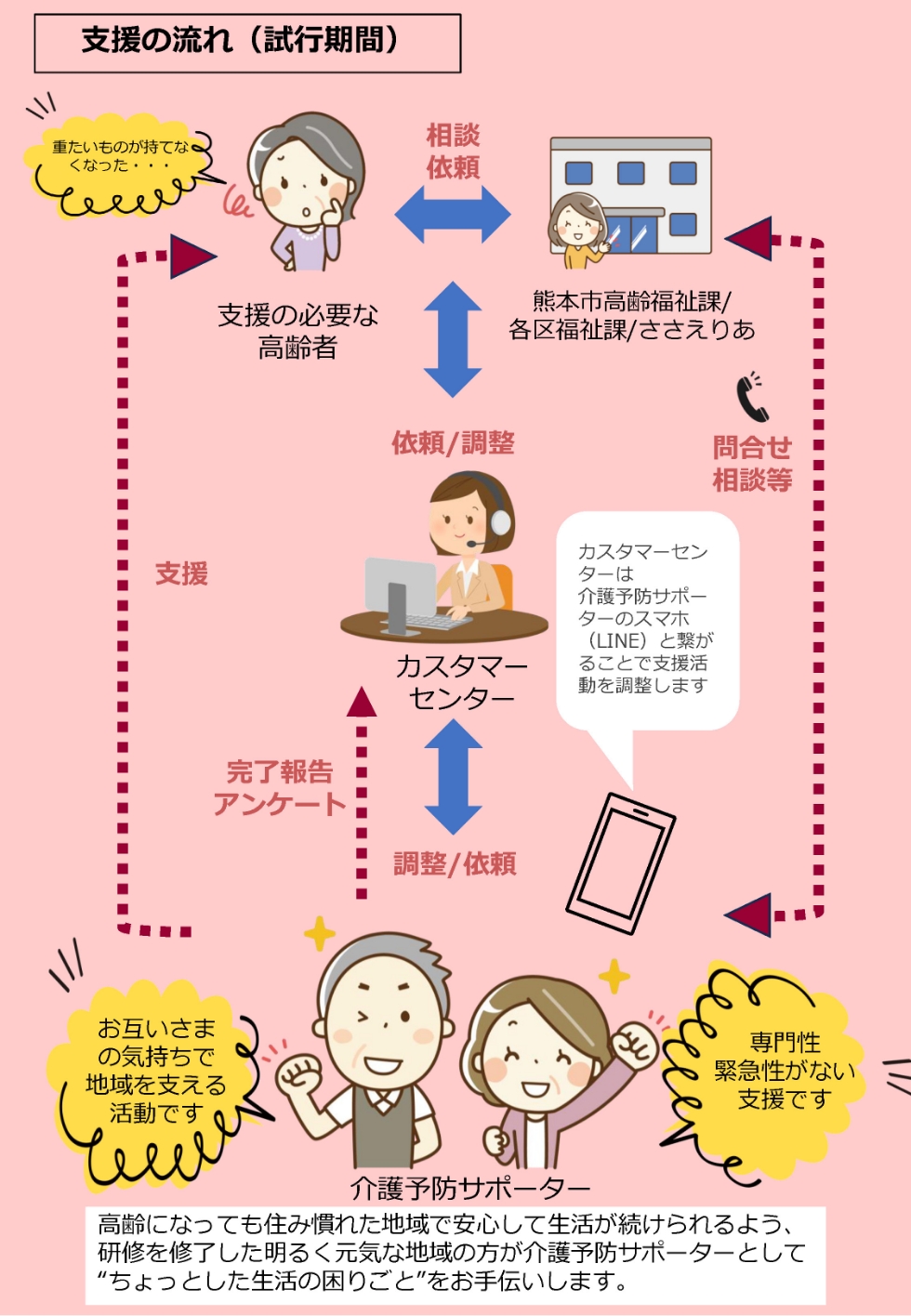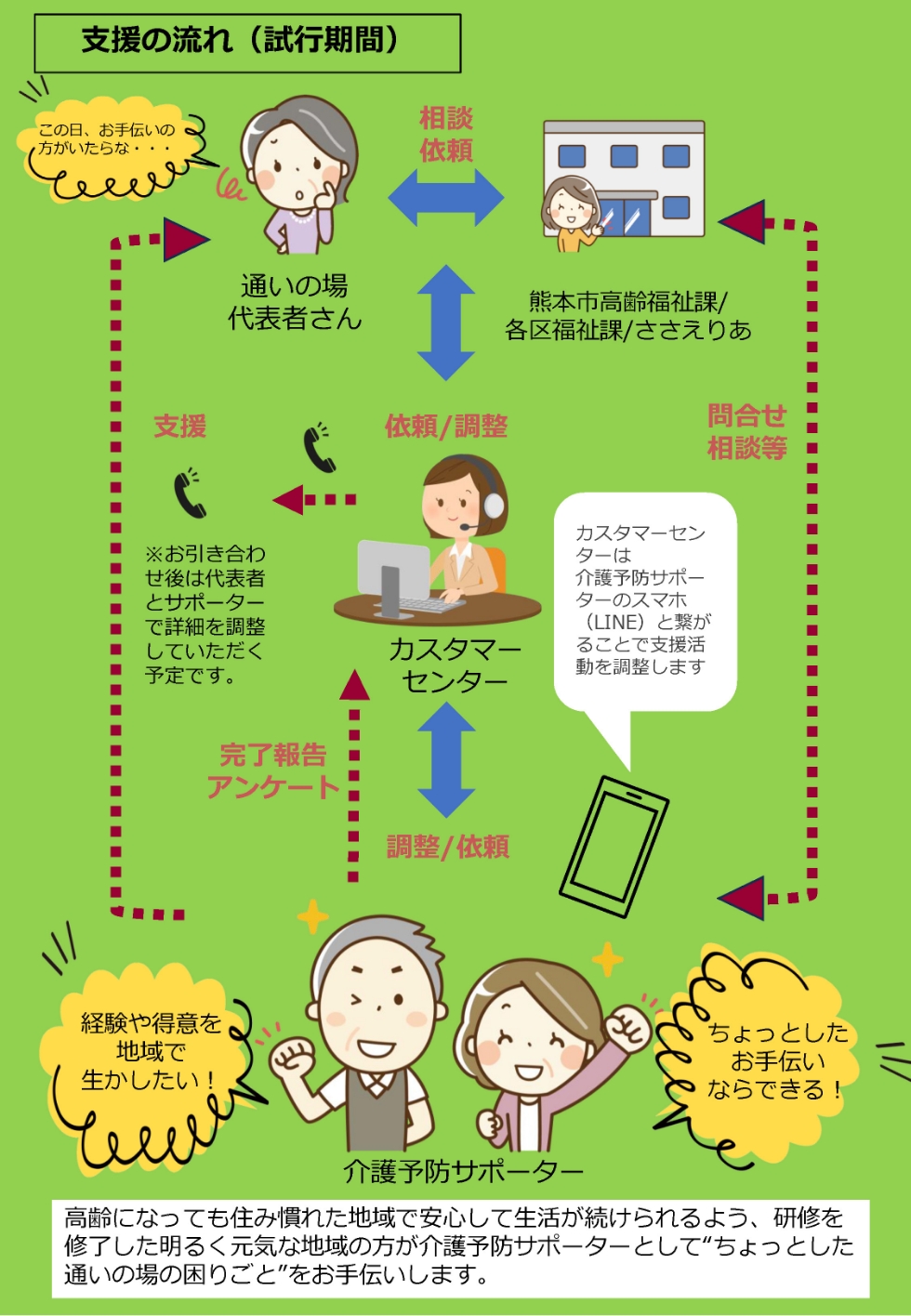 このことを受けて、熊本市では熊本市介護予防サポーターの活躍の場を無理なく広げていく為に、地域で困っていることとサポーターとのマッチングを試行することになりました。