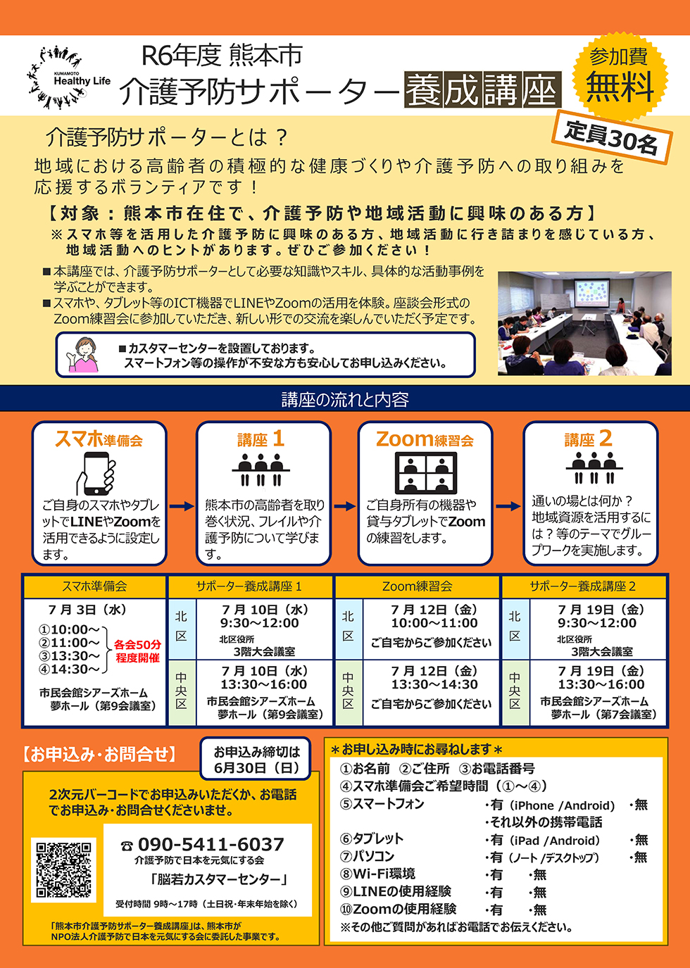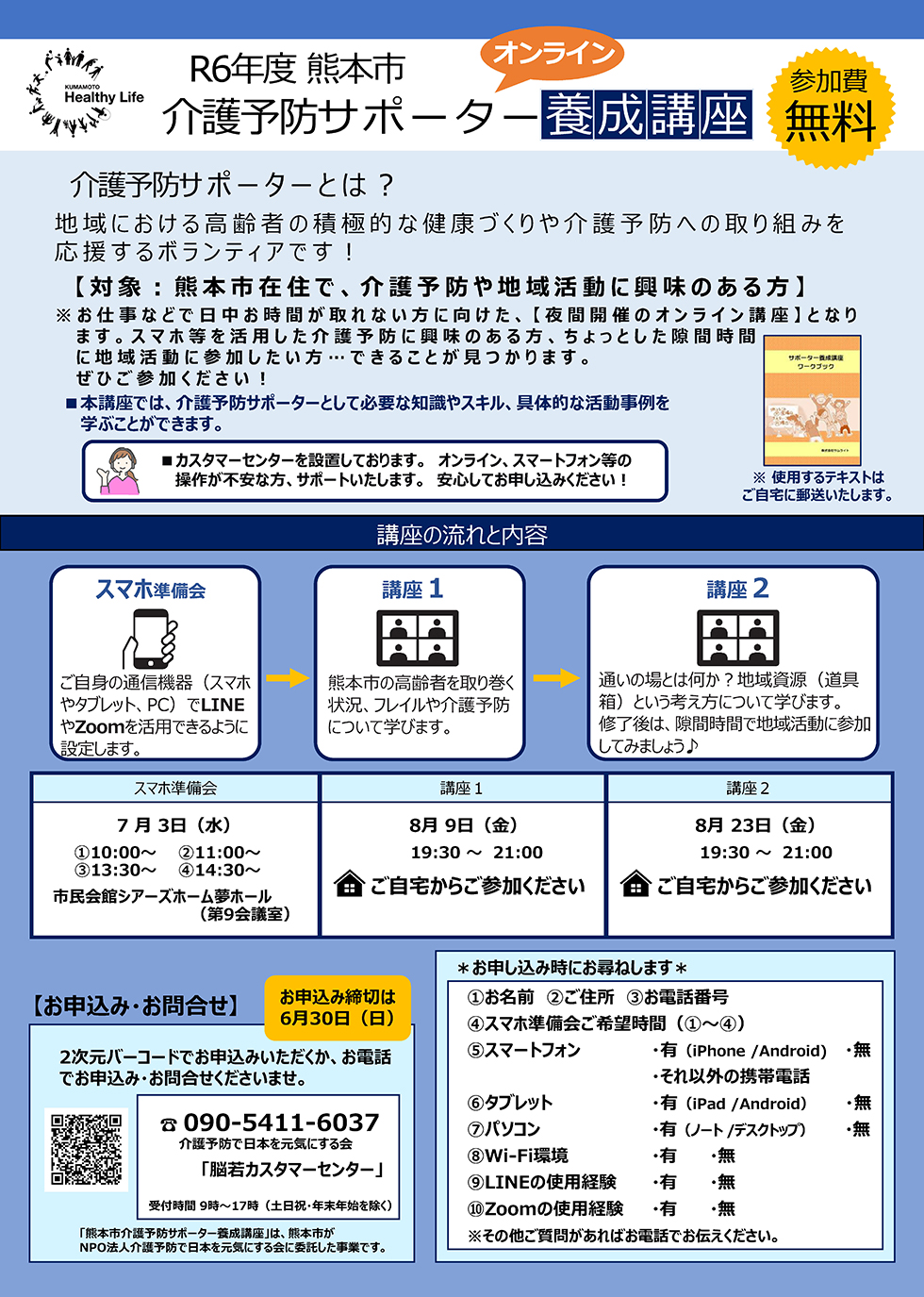 R6年度 熊本市介護予防サポーター養成講座 がはじまります 介護予防サポーター 2024.06.18 いつも地域活動へのご協力、ありがとうございます。 さて、R6年度の介護予防サポーター養成講座が来月3日より、いよいよスタートします。 今年度は、参集型とオンラインの講座があります。受講者の年齢は問いません。 すでにサポーターの方の為のフォローアップ講座は秋以降開催予定ですのでお楽しみに!