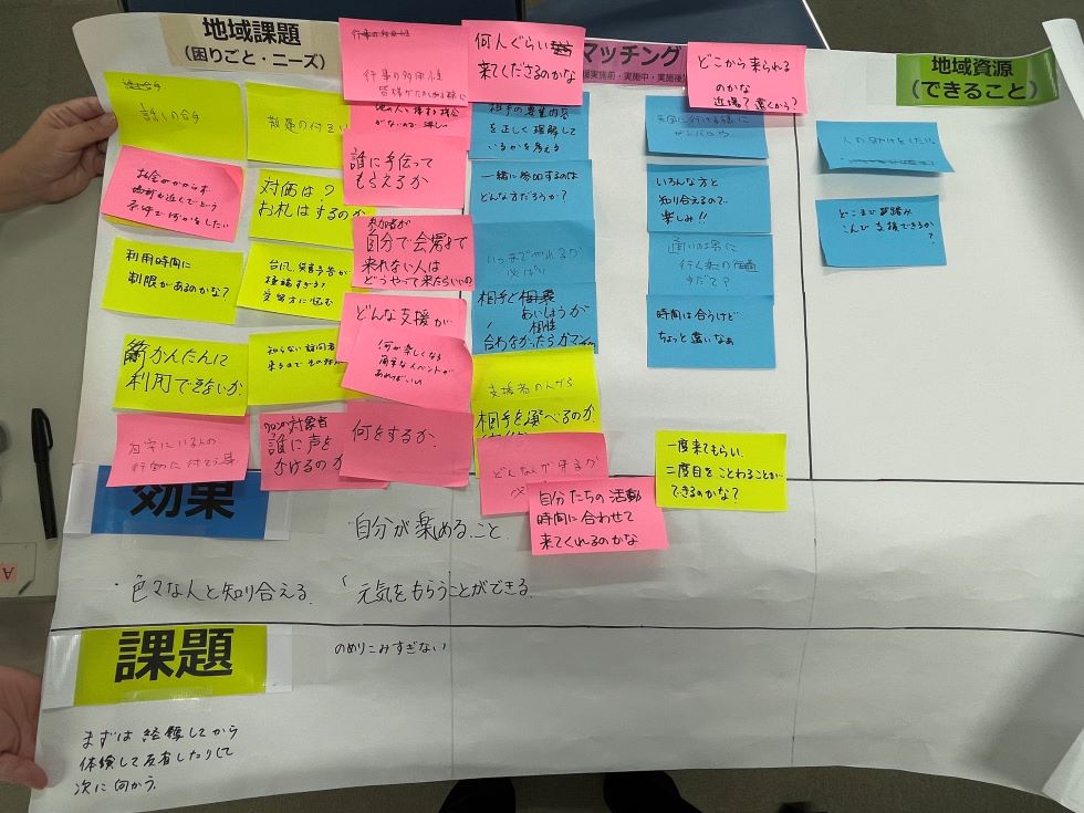 「マッチングとは何か?」を掘り下げる為に、実際の地域資源マッチングをグループワークで整理しました。サポーターの皆さんと「地域づくり」について様々な意見がでました。