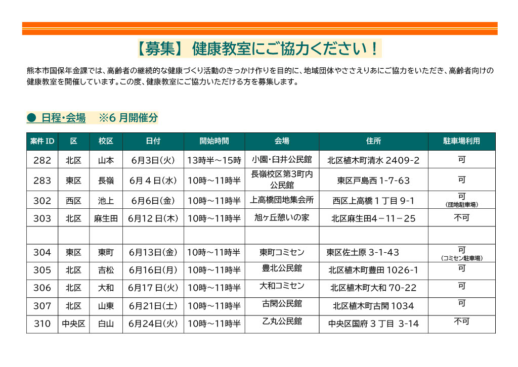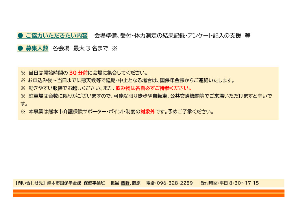 【国保年金課】健康教室の体力測定のご支援について(6月実施) 地域資源マッチング 2025.05.30 【介護予防サポーターのみなさま】 熊本市国保年金課では、高齢者の継続的な健康づくり活動のきっかけ作りを目的に、地域団体やささえりあにご協力をいただき、高齢者向けの健康教室を開催しています。この度、健康教室にご協力いただける方を募集します。 ※詳細は以下のチラシをご参照ください。 ※画像をクリックすると拡大表示できます。